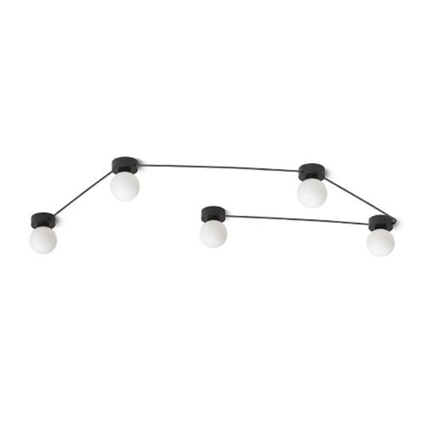 Fekete festett talapzaton elhelyezett, üvegárnyékolóval ellátott mennyezeti vagy fali lámpák, amelyek fekete kábelekkel egy vonalban vannak összekötve. A lámpák az Ön elképzelése szerint csoportosíthatók. Alkalmas G9 foglalattal rendelkező LED fényforrásokhoz.