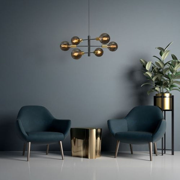 Függőlámpa dekoratív sárgaréz foglalatú zárósapkákkal. A lámpa a karok állításával alakítható. Alkalmas E27-es foglalattal rendelkező LED fali lámpákhoz.