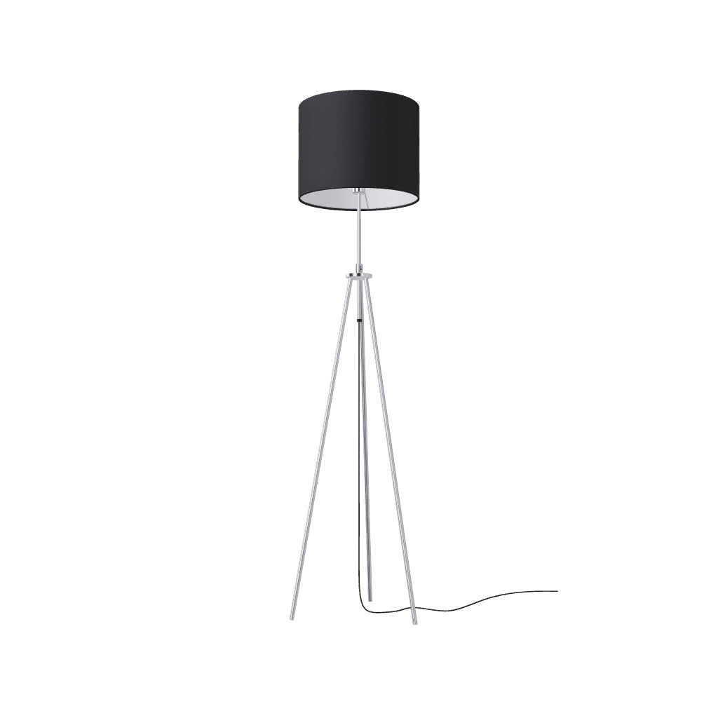 Állólámpa háromlábú állványon, a magassága állítható. Textil búrával E27 foglalatú izzóhoz.