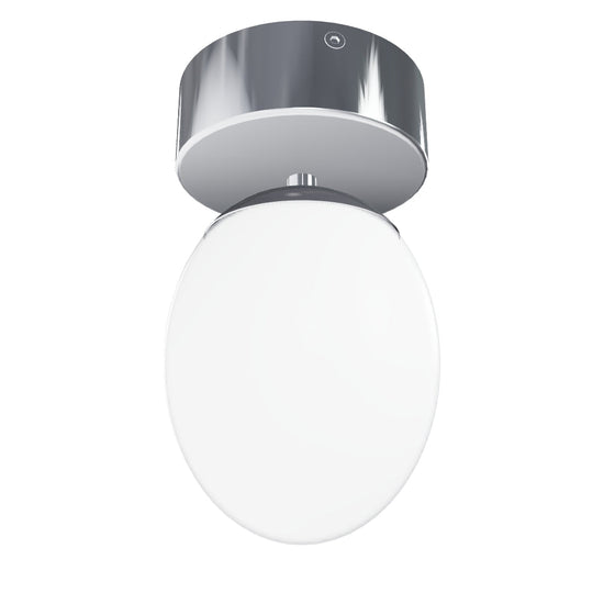 Ovális, üveg, mennyezeti lámpa króm talppal, nedves környezetben alkalmazható.