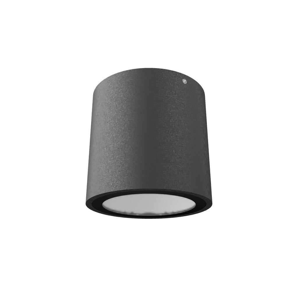 Kültéri, LED mennyezeti lámpa. Henger alakú lámpa átlátszó üveg borítással, fekete díszítéssel.