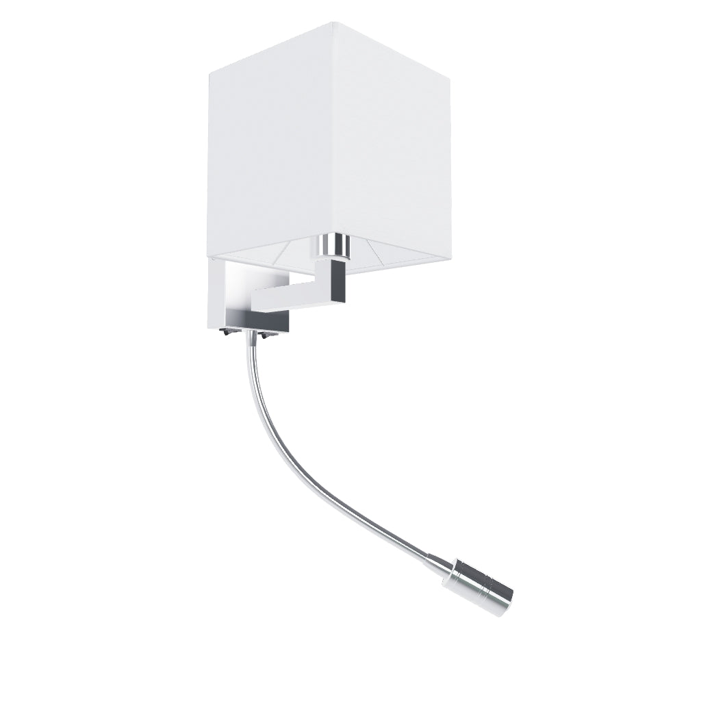 Fali lámpa textil búrával, rugalmas karral, LED dióda reflektorral. A lámpának két fényforrása van, amelyek külön-külön vezérelhetők a lámpa szögletes alapján található kapcsolókkal.